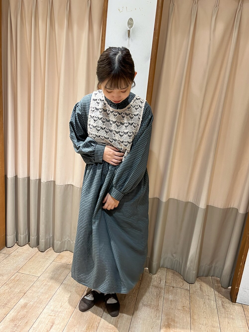 yanoのワンピース「レースベスト付チェック柄ワンピース」を使ったコーディネート