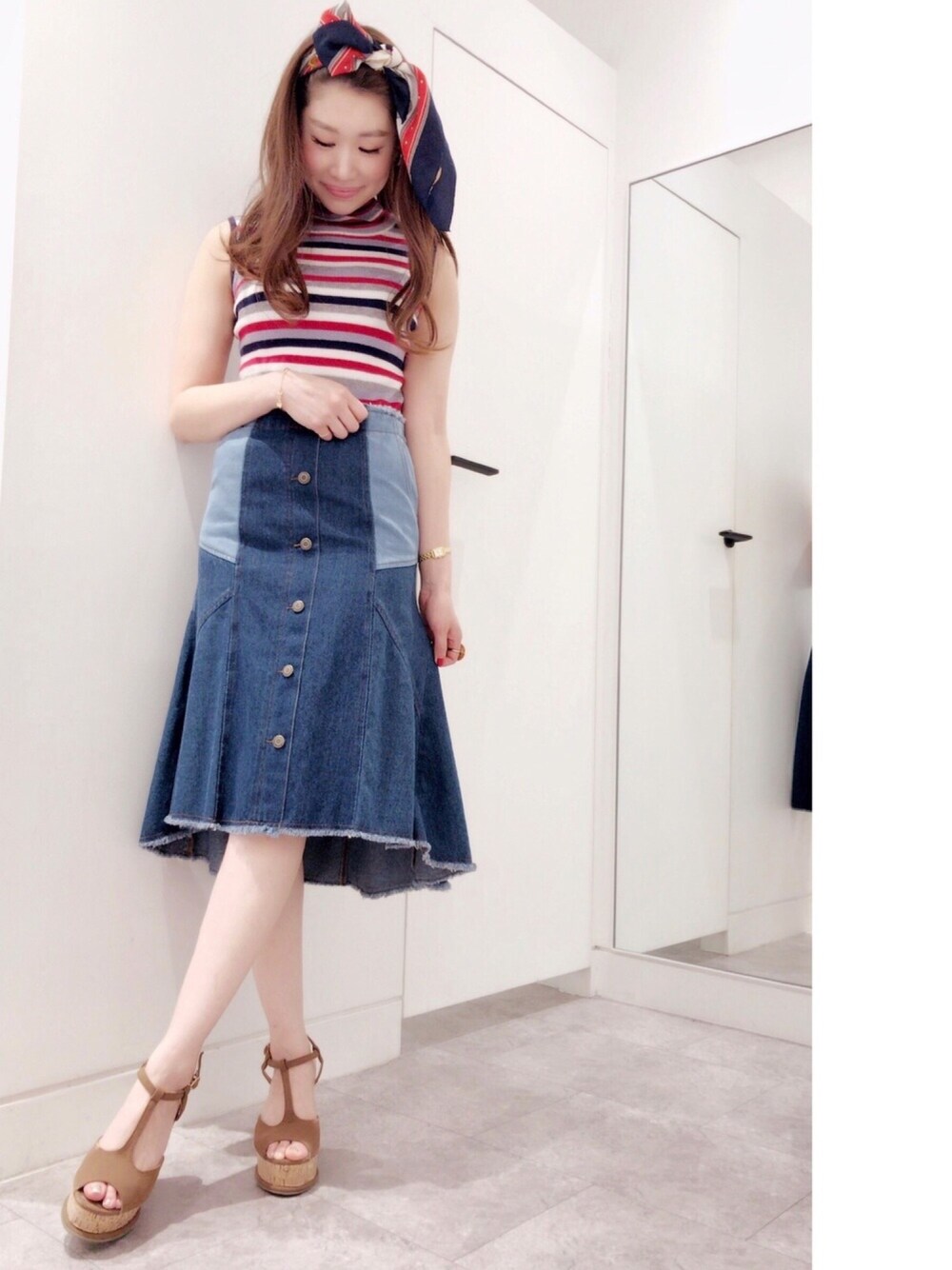 リメイク風デニムスカートは、レディなシルエットでカジュアル過ぎないところがお気に入り😋❤️スカーフアレンジで、夏気分が早くも高まります⛵️💙💚❤️