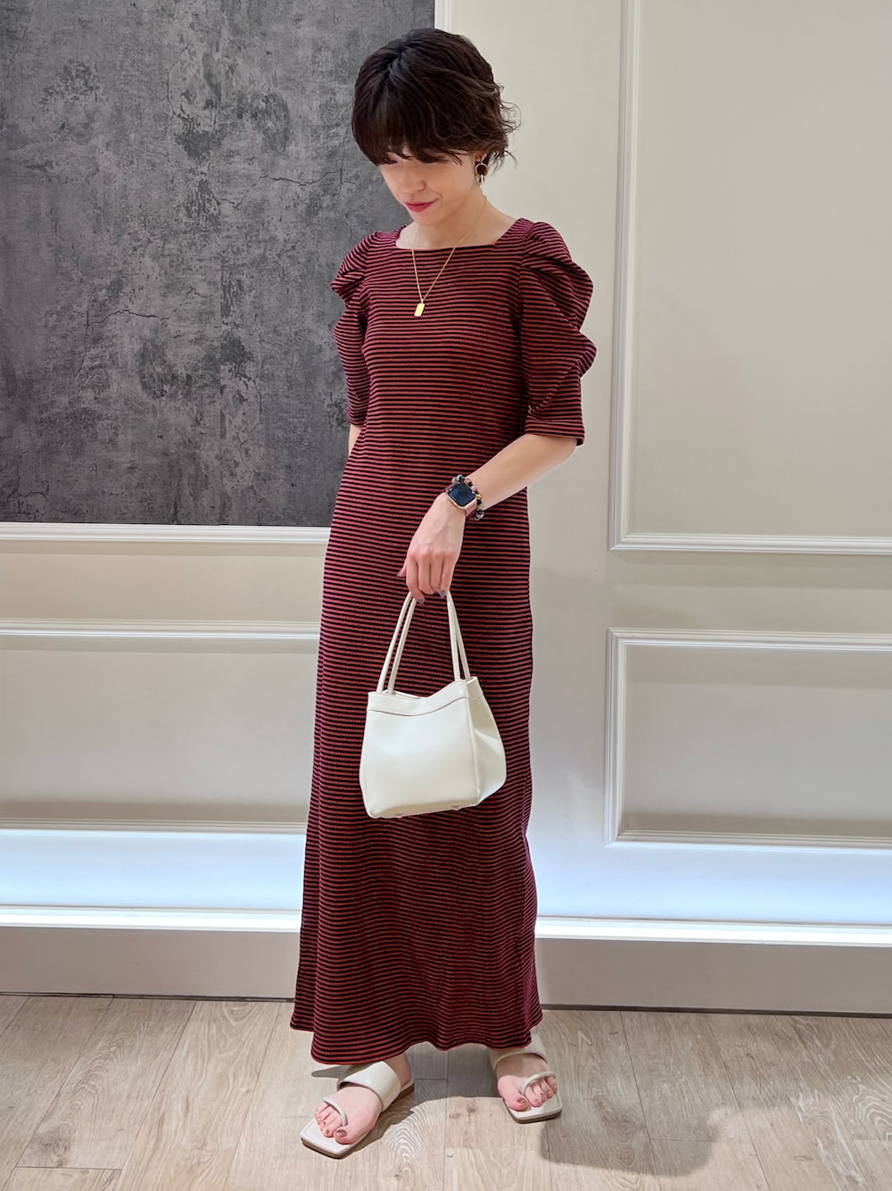 TOTO_fredy(FREDY&GLOSTER モザイクモール港北店)のワンピース「テレコボーダー袖ボリュームワンピース(前後2WAY)」を使ったコーディネート