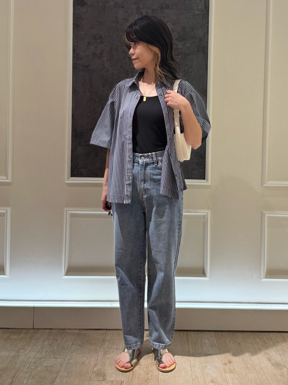 ○FR刺繍ハーフスリーブタックシャツ 袖やバックに入っているタックがポイント! 少しハリ感のある素材で綺麗めにも◎ ○ストレートデニムパンツ ストレート足長効果アイテム! 柔らかな素材なので着心地が◎