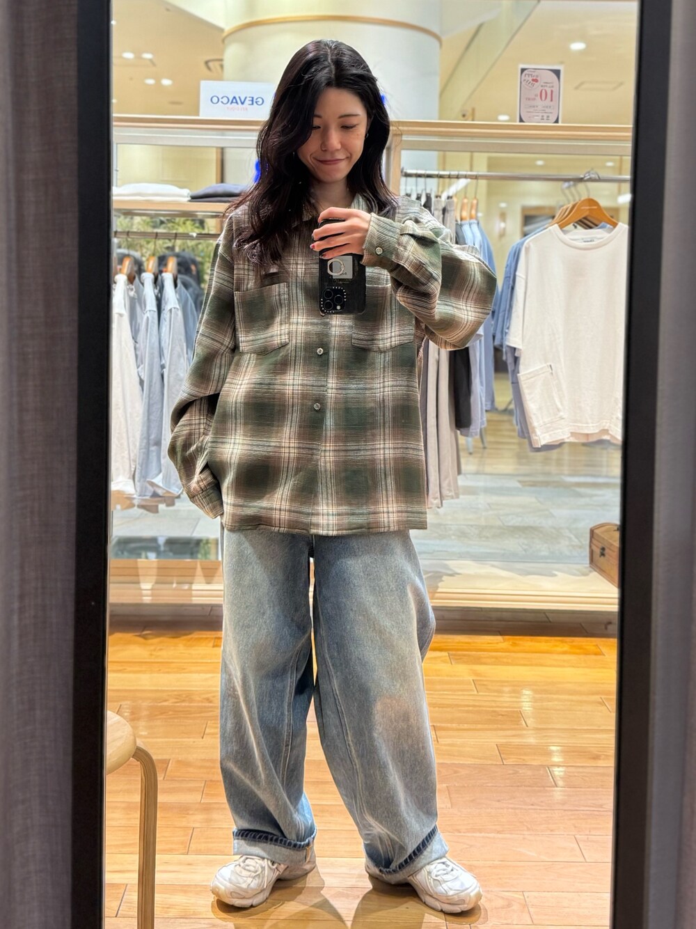 チェックシャツコーデ M,Lサイズ展開でオーバーサイズでゆったり着れます!男女兼用アイテムなので、スカートと合わせたり、デニムとの相性が◎