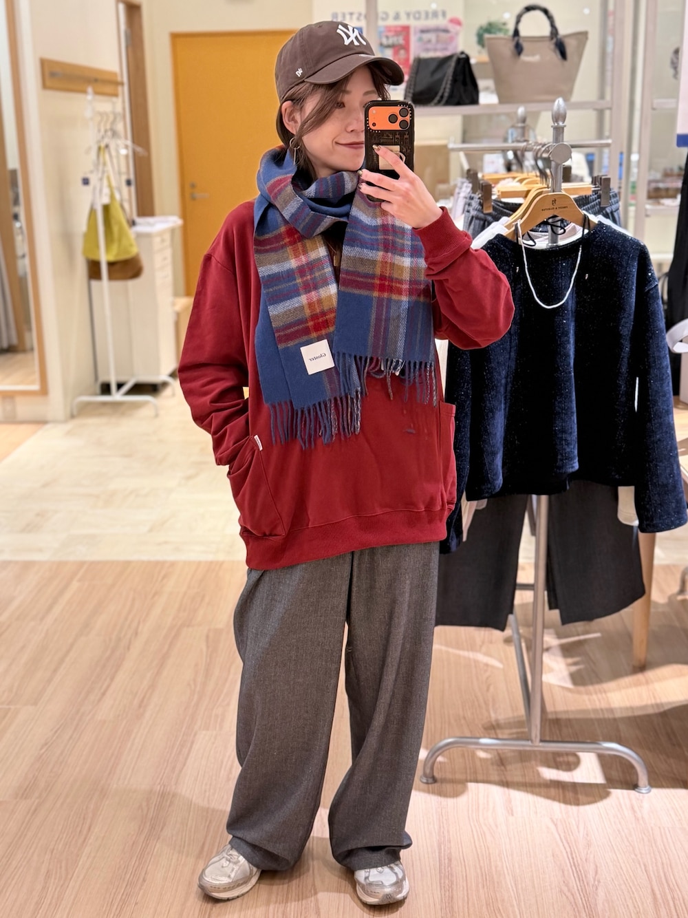 クリスマスっぽいコーデ🎄 赤のスウェットの色味が可愛くて着てみました! マフラーもつけて差し色に✨