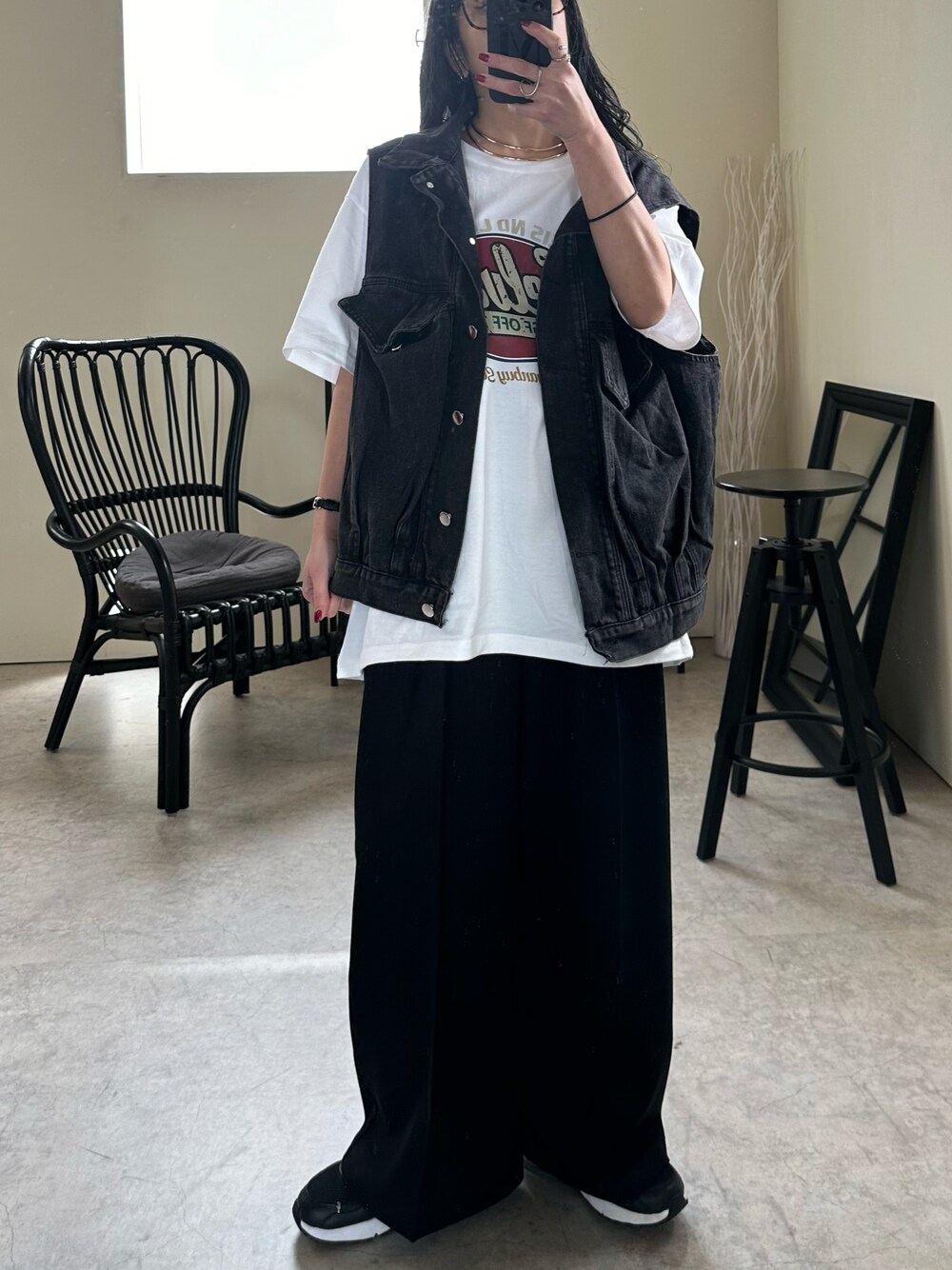 新作のデニムベスト👀 この美脚ワイドパンツ脚長効果抜群だよ🖤