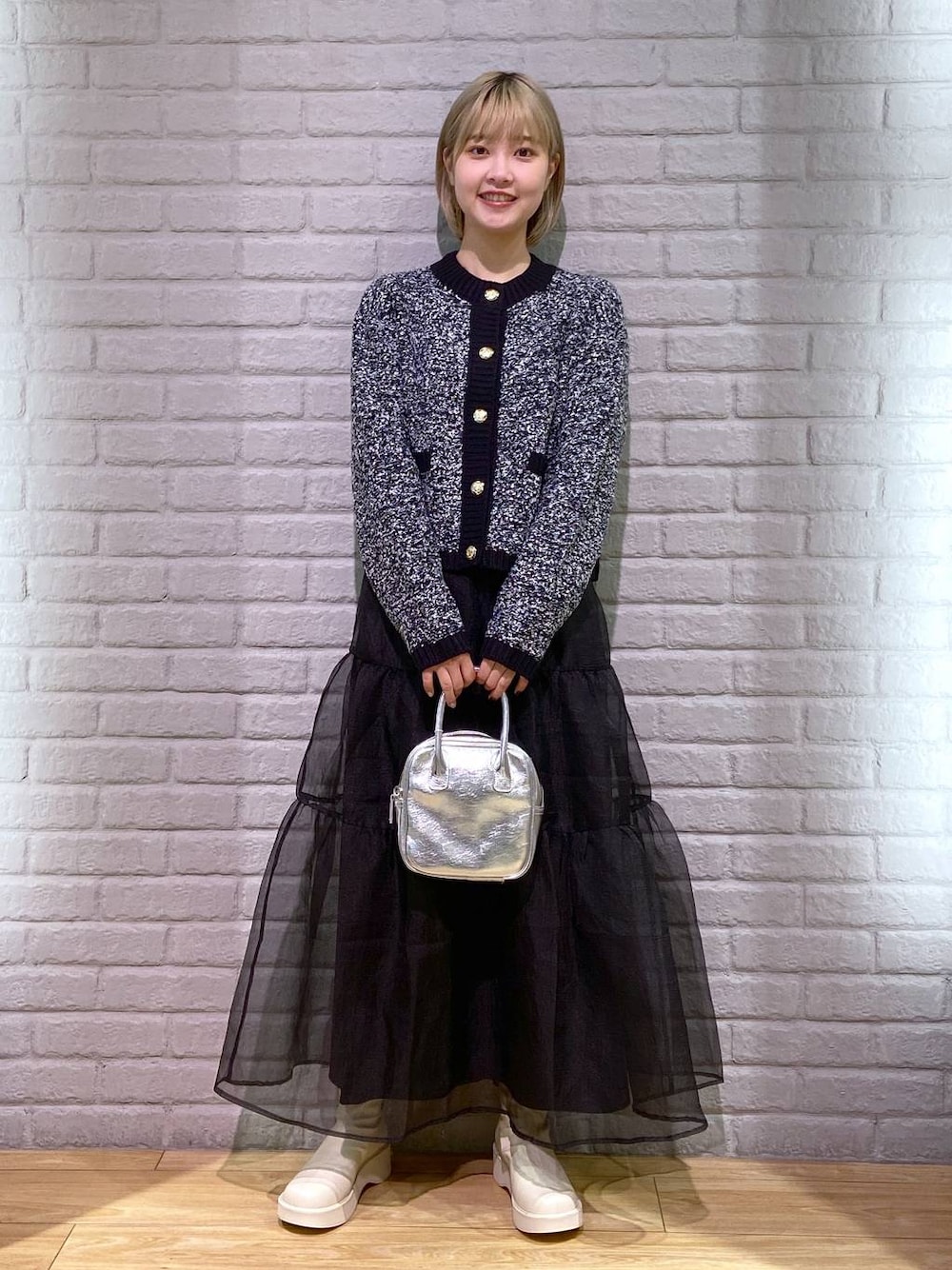 ⭐各アイテムのおすすめポイント  ̄ ̄ ̄ ̄ ̄ ̄ ̄ ̄ ̄ ̄ ̄ ̄ ̄ ̄ ̄ ̄ ̄ 【トップス】 ツイードのデザインが可愛いニット! 金ボタンが綺麗で1枚着ると女性らしい印象に✨✨ カーディガンなので羽織りとしても着て頂けます! 【ボトムス】 程よい光沢と張りが特徴のオーガンジー素材のスカート! ボリューム感が可愛く綺麗めに着て頂けます♪ スウェットやニット合わせがおすすめ◎