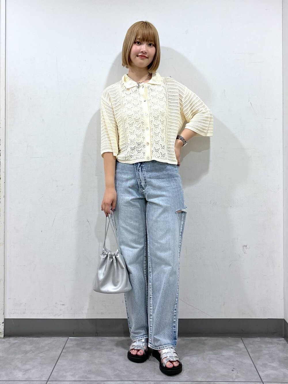 ⭐各アイテムのおすすめポイント  ̄ ̄ ̄ ̄ ̄ ̄ ̄ ̄ ̄ ̄ ̄ ̄ ̄ ̄ ̄ ̄ ̄ 【トップス】 サマーニットポロ! 透かし編みなので涼しく着用できます🙆♀️ コンパクトな丈感なのでボトムスはパンツ合わせがスッキリしていておすすめです🌟 【ボトムス】 定番のCONEデニムアシメ! 人気のカットデザインがポイントでウエストはハイウエストでフィット感が良く、裾にかけては程よくゆとりのあるサイズ感で着心地が良いです🙆♀️