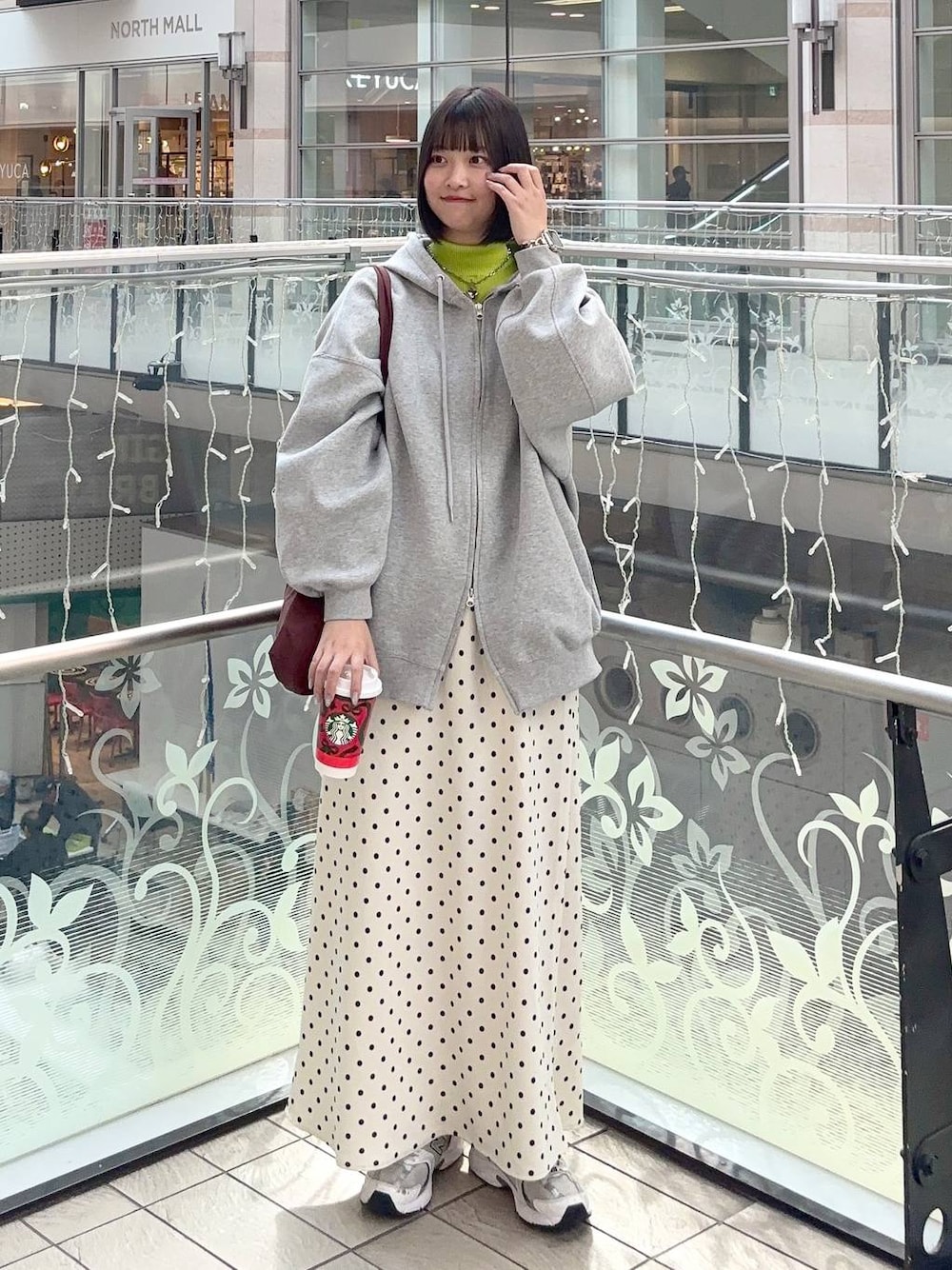 ⭐各アイテムのおすすめポイント  ̄ ̄ ̄ ̄ ̄ ̄ ̄ ̄ ̄ ̄ ̄ ̄ ̄ ̄ ̄ ̄ ̄ 【トップス】 トレンドのフードパーカ! キレイめなダンボールの素材なので、カジュアルすぎないのがポイントです✨ オーバーサイズで安心感のある丈感なのでお尻周りが気にならないです! 【ボトムス】 セミフレアシルエットのサテンスカート! ウエストはオールゴム仕様なので伸縮性があり楽な着心地です✨ 腰回りは程良くフィット感があり、裾にかけて少しフレアなシルエットになっているので動きやすいです◎