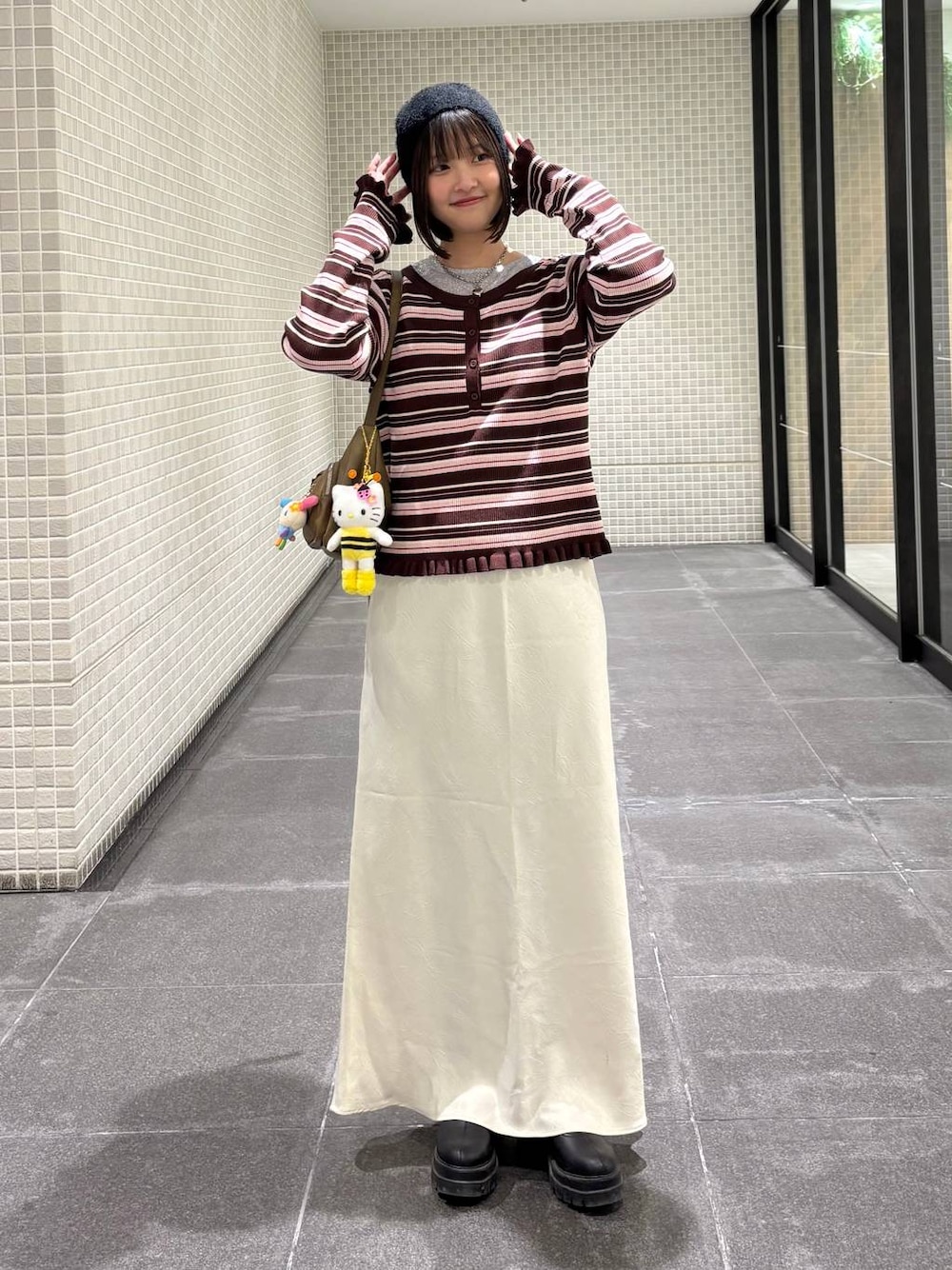 ⭐各アイテムのおすすめポイント  ̄ ̄ ̄ ̄ ̄ ̄ ̄ ̄ ̄ ̄ ̄ ̄ ̄ ̄ ̄ ̄ ̄ 【トップス】 マルチボーダーのニットプルオーバー! 袖口と裾にプチフリルを編み立ているのがポイントです◎ 可愛らしい色合わせが春にぴったりです✨ 【ボトムス】 セミフレアシルエットのサテンスカート! ウエストはオールゴム仕様なので伸縮性があり楽な着心地です✨ 腰回りは程良くフィット感があり、裾にかけて少しフレアなシルエットになっているので動きやすいです◎
