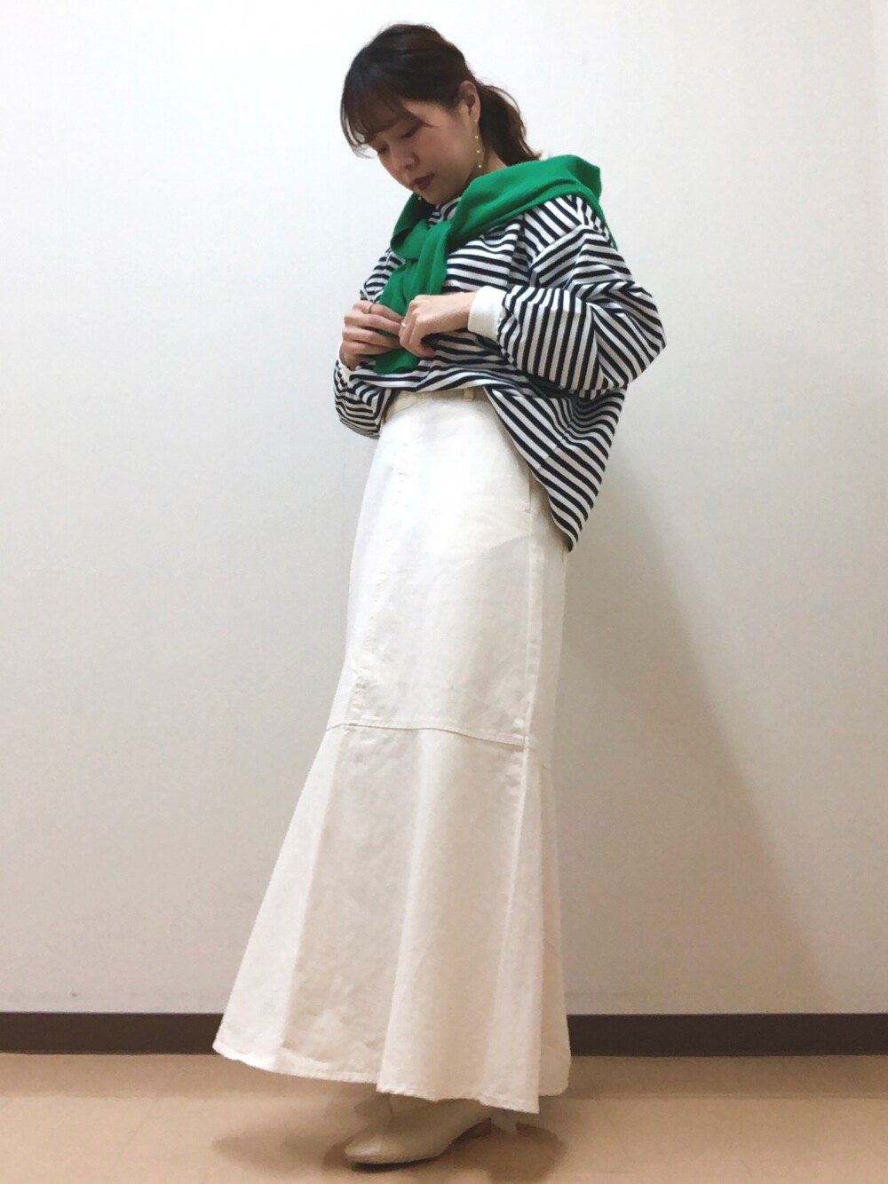 🔍トップス 普段着用サイズM 今回着用サイズFree 【着用感】 生地の厚さがいまの季節にぴったりでとても着やすいです!手首のところにはボーダーが無いので細く見えます! 🔍トップス 普段着用サイズM 今回着用サイズFree 【着用感】 ロング丈なスカートですがブーツを合わせると少しカッコよさが出るのでそちらもおすすめです!