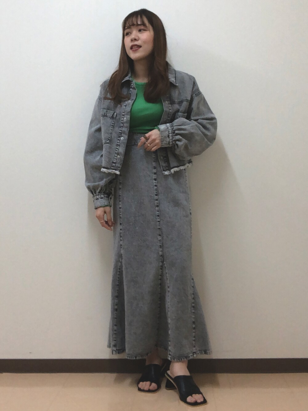 🔍トップス 普段着用サイズM 今回着用サイズFree 【着用感】 ゆったりと着れる伸縮性のあるトップスです。縦ラインにリブが入っています! 🔍トップス 普段着用サイズM 今回着用サイズFree 【着用感】 ショート丈のデニムジャケットです!裾がフリンジ仕様になっていて可愛いです!低身長の方にはスタイルアップにもなります! 🔍トップス 普段着用サイズM 今回着用サイズFree 【着用感】 形がおても綺麗なマーメイドスカートです。背中側にチャックがついています。セットアップアイテムです!