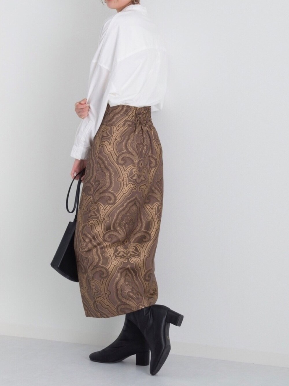 織り目が美しいジャガードスカート ブラウンをベースにゴールドが入った高級感あふれる仕上がりに。 トップスを明るめにホワイトを選んで、全体のバランスをとりました。