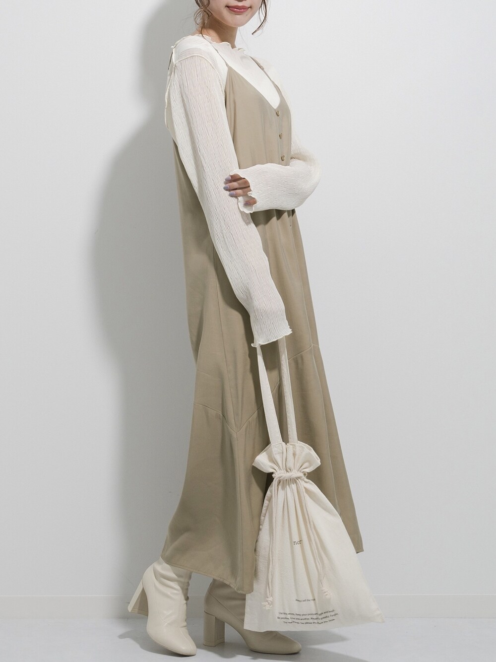 ベージュで秋コーデを楽しむ◎ このアイテムは3点セット(キャミワンピース、シアートップス、巾着バック)なのでコーデの幅が広がる!