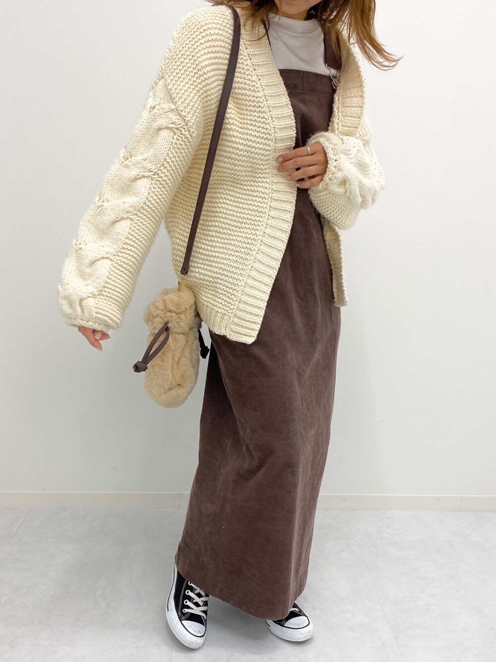 カーディガンを羽織れる季節がやってきてワクワク🧶 ジャンスカ合わせで今っぽくけどほんのりレトロチックな感じが◎