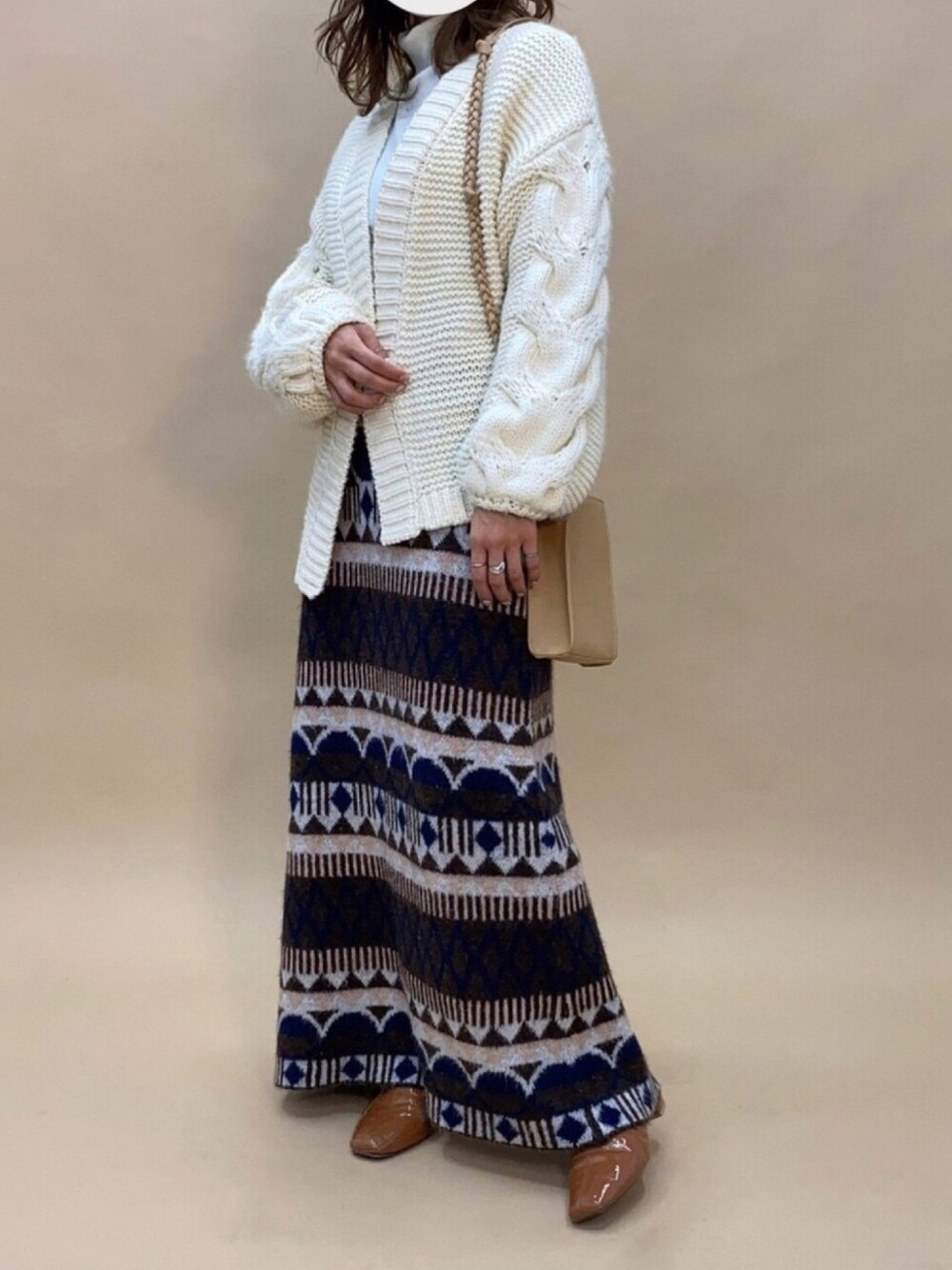ニットオンニットでも編みが異なるので違和感なく着用できます🙆🏻♀️ スタッフ身長155cmで、5cmヒールでこの丈感になります! なので150cm台の方は着用するトップスによりますが、ウエスト1回折るといい丈感になります!