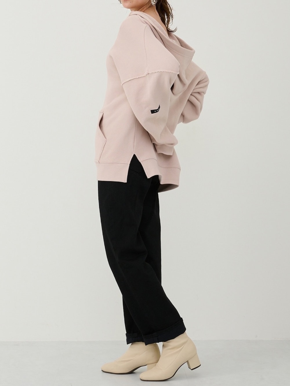 このパーカー、優しい肌触りでこの時期から春にとてもぴったりです! 深いVネックで首元、サイドスリットでレイヤードも楽しめます。
