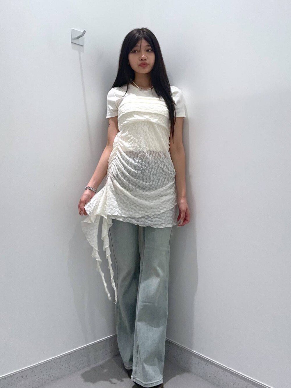 mnqiinのデニムパンツ「【2025SS】オーバーダイフレアデニム」を使ったコーディネート