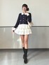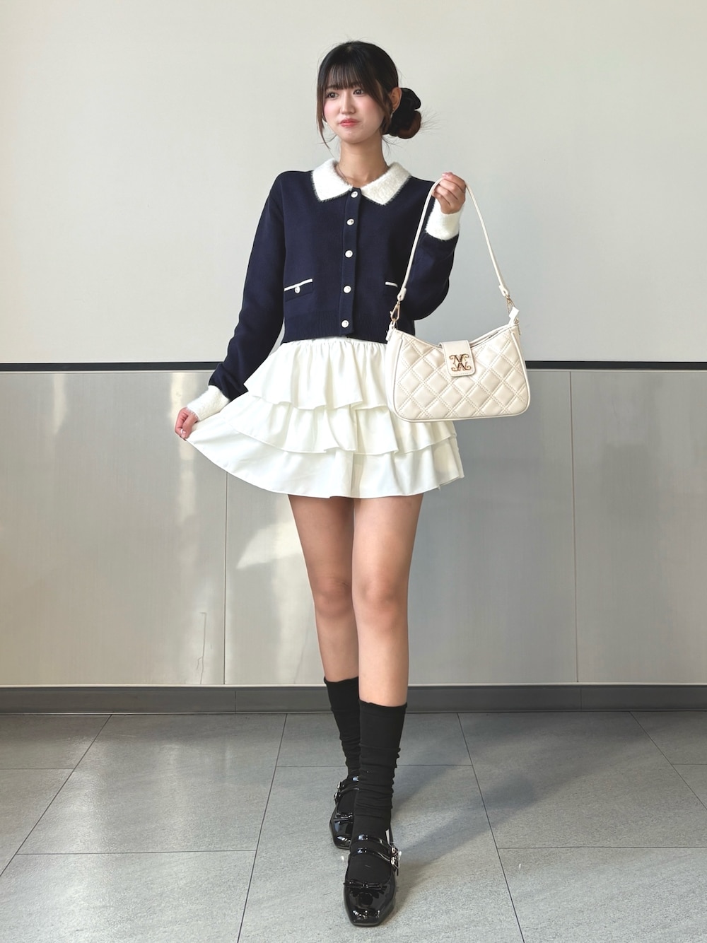 ネイビーのカーディガンに白い衿と袖口の配色が映えるクラシカルな一枚✨ ゴールドのボタンやポケットデザインが上品さをプラスしてくれます💡 ボトムにはフリルたっぷりのホワイトティアードスカートを合わせて、華やかでフェミニンな印象に🤍 動くたびに揺れるフリルがコーデ全体を軽やかに見せてくれます🌸 足元は黒ソックス×エナメルローファーでクラシカルにまとめつつ、ほんのりトレンド感をプラス🖤✨ バッグはキルティングのホワイトを選んで、上品ガーリーな雰囲気をさらに引き立てました👜 デートや女子会はもちろん、ちょっとしたお出かけにもぴったりのきれいめガーリースタイルです☁️💫 Instagram @mnrxing_