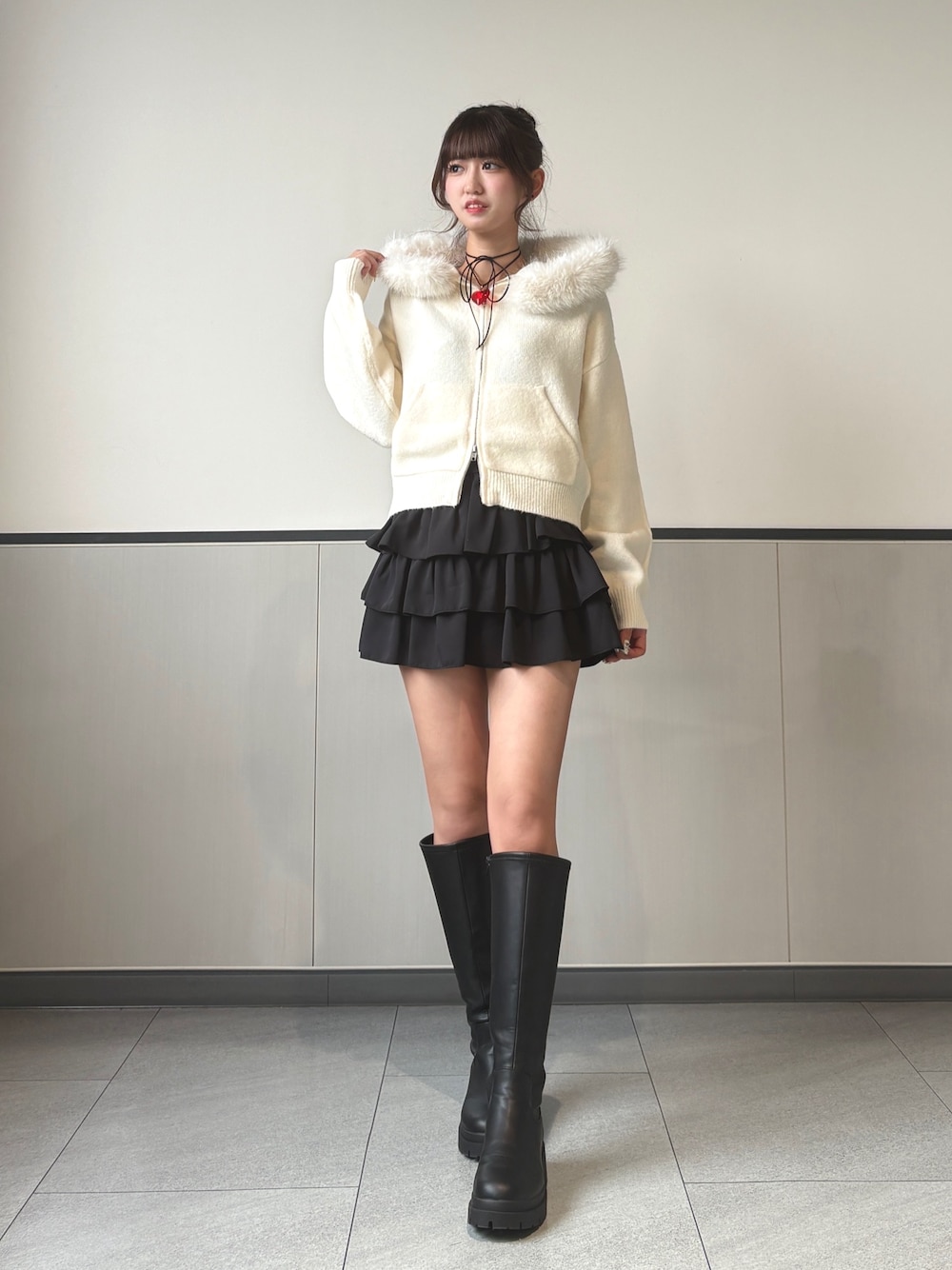ファー付きカーデでふんわり可愛く、 ティアードミニで軽やかに動きをプラス🎀 首元のリボンチョーカーが ガーリーな中にピリッとモード感を添えてくれるアクセント🖤 ロングブーツで脚長効果も抜群✨ 全体をモノトーンでまとめて、 甘すぎない“大人ガーリー”を演出🤍 冬のデートやお出かけにもぴったりな 上品かわいい甘辛MIXコーデです❄️ Instagram @mnrxing_