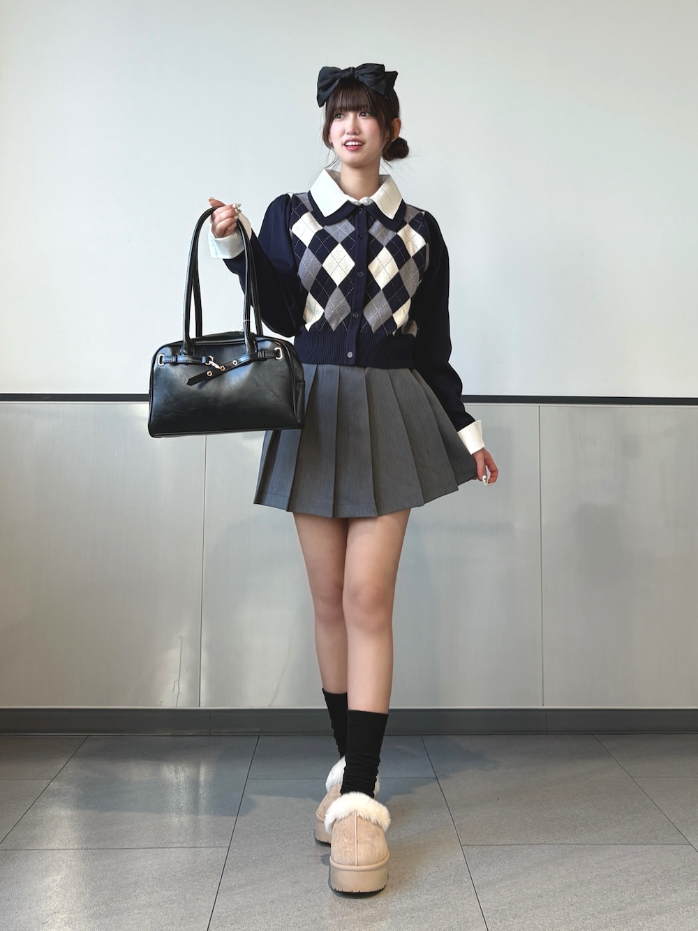 アーガイル柄が特徴的なこちらのニットトップスはなんとシャツがドッキングされてるの✨ プリーツと合わせてプレッピーなスタイルにしたよ💙🩶🏫 お出かけにもカフェにも様々な場面で活躍するアイテム是非ゲットしてみてね⤴️🪽 Instagram @mnrxing_