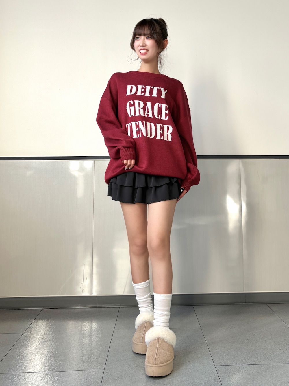深みのあるボルドーニットが視線を集める、 冬のほっこりガーリーコーデ🍒✨ ゆるっとしたサイズ感が可愛くて、 落ち感のある袖が女の子らしさを引き立ててくれるよ♡ ロゴデザインでカジュアル感もほどよくプラス👍🏻 合わせたのは黒のフリルミニスカート! 赤×黒の組み合わせは最強にあざとかわいいバランス🖤 足元は白ソックス×ふわもこシューズで 季節感たっぷりの甘さをON⛄️💗 ゆるカジだけどちゃんと“可愛い”が詰まった デートにもピッタリのスタイルだよ〜! Instagram @mnrxing_