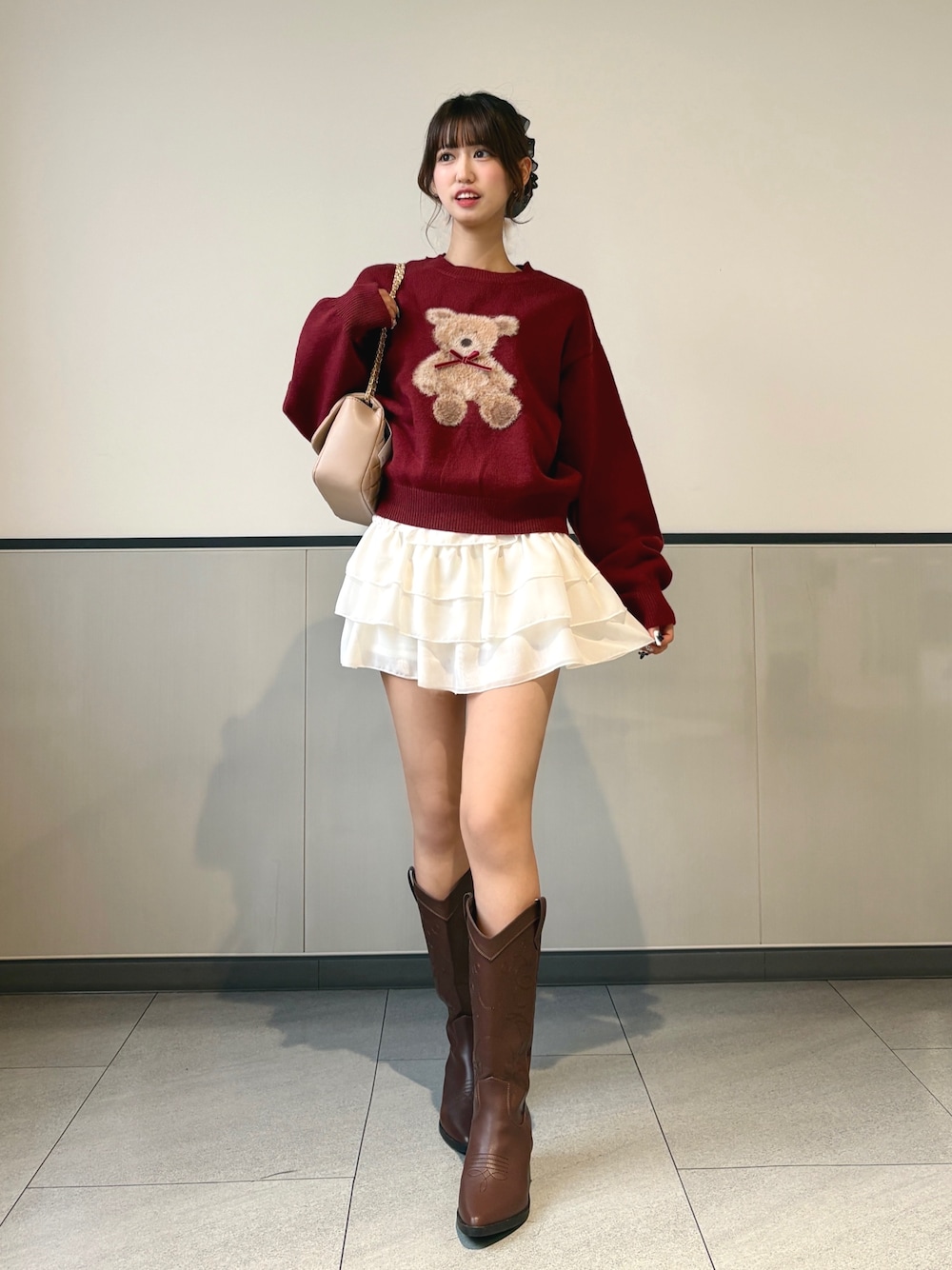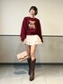 赤のくまちゃんニットに、ふわっと広がるミニスカ合わせて甘めにまとめたよ♡ 足元はウェスタンブーツでトレンド感と大人っぽさプラス👢✨ ベージュ小物で全体のトーンをやわらかくしてバランス可愛く仕上げたよ😌🎀 Instagram @mnrxing_
