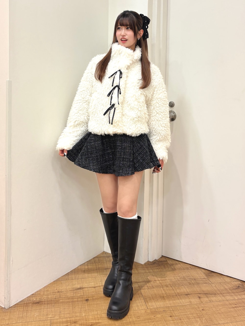 ふわっふわのもこトップスが主役のあったかガーリーコーデ𓂃🎀 ブラックのツイードスカートで甘さを引き締めて、大人かわいいバランスにしたよ♡ ロングブーツと白ソックスで脚元盛れるのもポイント🥹🫶 Instagram @mnrxing_