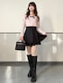 淡ピンク×黒の組み合わせが最強ガーリーなコーデ♡ 胸元のリボンとレースがぱっと目を引いて、1枚で主役級の可愛さ🎀 スカートはふわっと広がるシルエットで、歩くたびに女の子らしさアップ…! 足元はロングブーツでバランスよく締めて甘さを控えめに◎ バッグも黒で統一して、全体がまとまる“きれいめガーリー”に仕上げました🖤 Instagram @mnrxing_