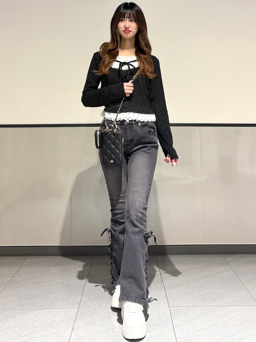 ドット×レースの 王道ガーリートップスが主役🎀🤍 胸元のリボンと 裾レースが とことん可愛いのに ブラックだから甘すぎないのが優秀すぎる🥹✨ ボトムは 美シルエットのフレアデニムで 大人っぽさプラス👖💫 サイドリボンが さりげなくリンクしてて 細部までぬかりなし🎀 ブラックバッグで 全体をきゅっと引き締めて ホワイトスニーカーで 抜け感も忘れないバランス🤍 カフェ巡りも デートも “ちゃんと可愛い”って言われたい日に ぴったりコーデ🫶✨ ⸻ Instagram @mnrxing_