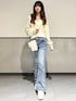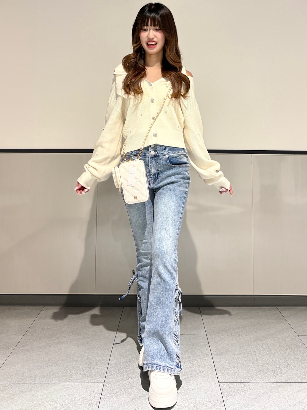 やわらかいアイボリーの オフショルカーデで 一気に春ムード全開🌸✨ さりげない肌見せと ゆるっとシルエットが 守りたくなる可愛さすぎる🥹🤍 肩はシアーのリボンになってるよ🎀 ボトムは 美脚見えフレアデニムで 甘さをほどよくカジュアルダウン👖💫 サイドリボンが ちゃんとガーリーさもキープ🎀 ホワイトバッグ&スニーカーで 全体を淡色でまとめて 統一感もばっちり⭐️ ⸻ Instagram @mnrxing_
