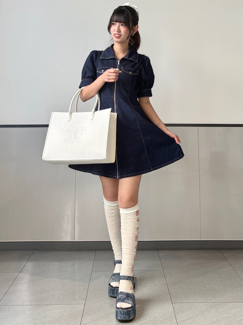 デニム素材のミニワンピで、甘さとカジュアルのいいとこ取り🤍🎶 フィット&フレアのシルエットが、スタイルを綺麗に見せてくれる パフスリーブでさりげなく可愛さプラスしつつ、上品な印象に🪄🍀 1枚でしっかり決まる主役コーデなのも嬉しいポイント 推し活などにも使える 大容量ホワイトのバッグで抜け感を出して、 全体を軽やかに🤍 ロングソックス×厚底で、トレンド感もしっかり押さえたスタイリングに✨ デートやお出かけにぴったりな、好印象ガーリーコーデ🎀 Instagram @mnrxing_