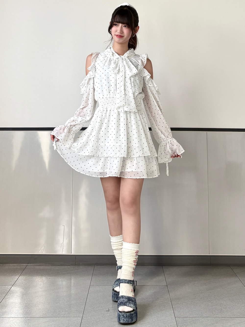 愛琉(INGNI イオンモール高崎)のワンピース「2Wayリボン肩あきフリル長袖ミニワンピース」を使ったコーディネート