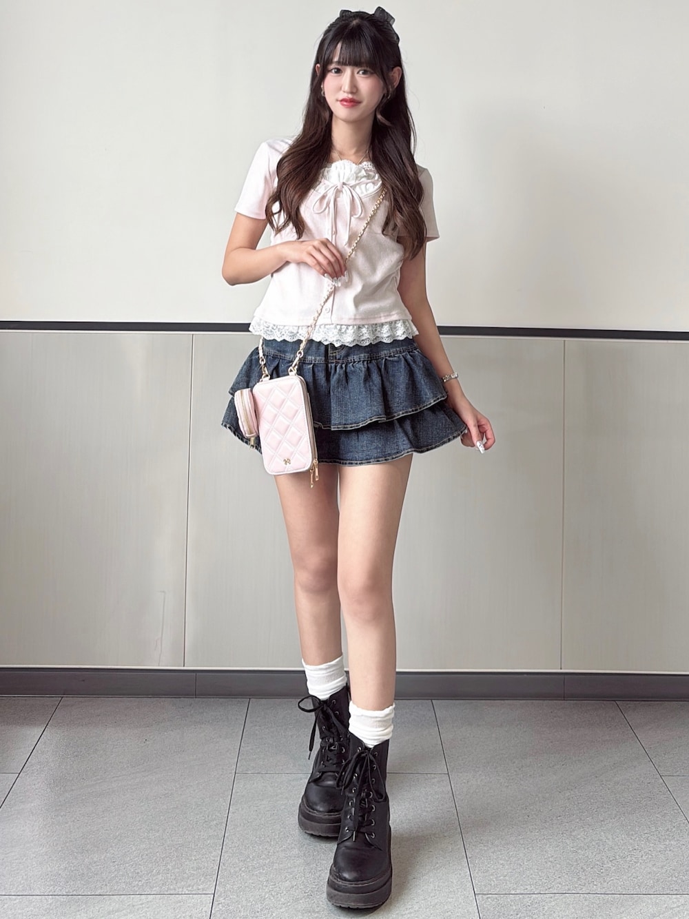 レイヤード風トップスが目を引く、甘さとカジュアルをミックスしたコーデ🎀🖤 1枚で重ね着してるように見えるデザインが可愛くて、デニム・スウェット・スカートなど幅広く合わせられる万能トップス🐈⬛✨ フリルデザインのデニムスカートは、これからの季節に大活躍間違いなし🖤 カジュアルなデニムにガーリーな要素がプラスされて、バランスよく着こなせるのがポイント🎶 コンパクトなトップスとの組み合わせで、スタイルアップも叶うシルエット🎀 Instagram @mnrxing_