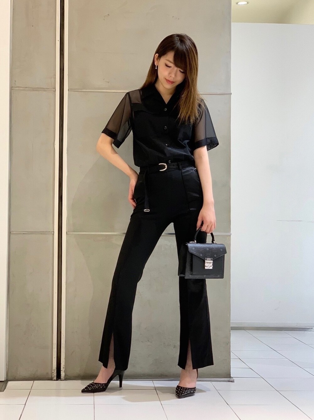 ワントーンコーデ。 シアーシャツでオールブラックでも重たくならない印象に。