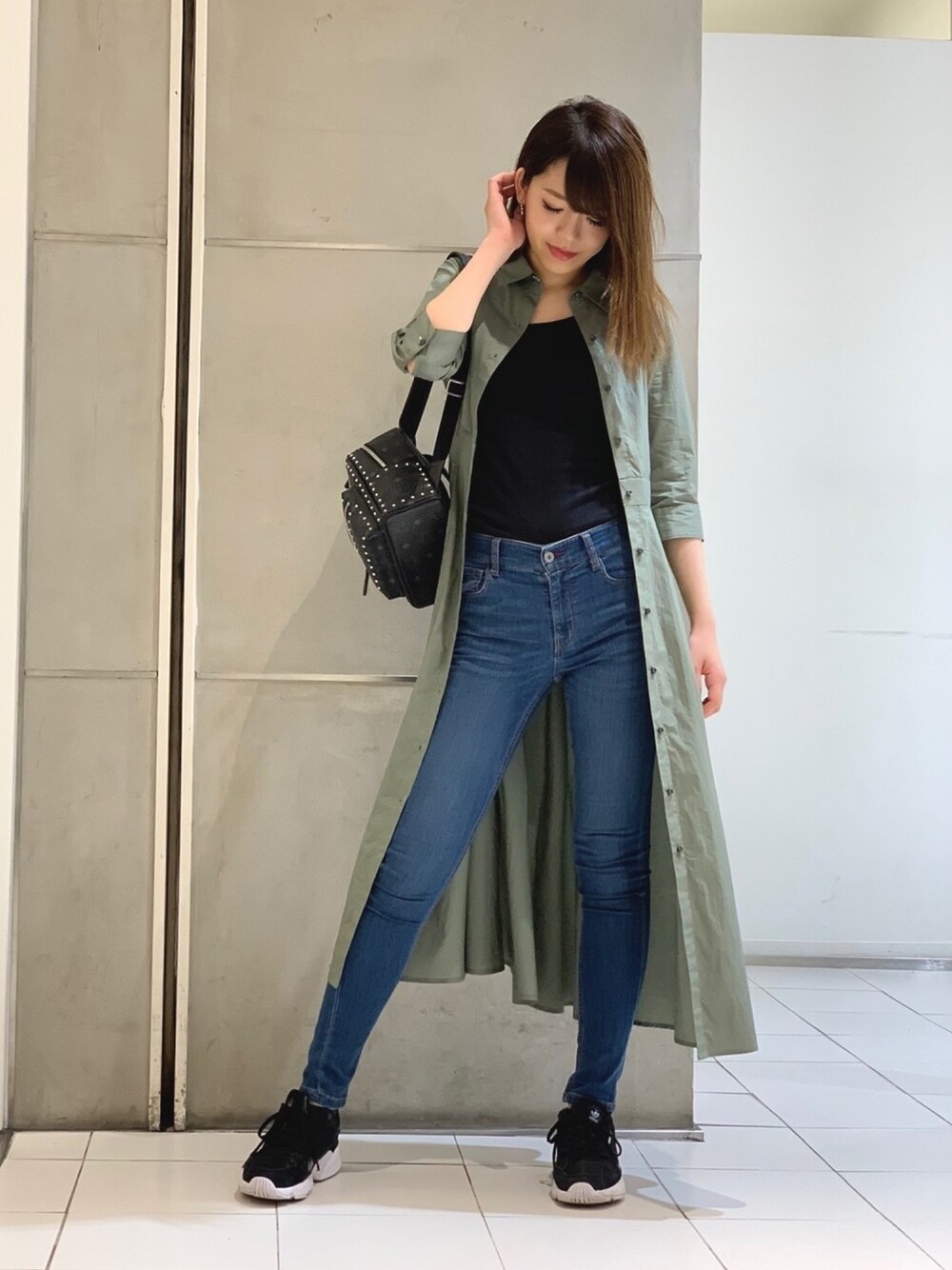 シャツワンピースは前開けで羽織としての着用も◎ デニム×スニーカー合わせでカジュアルダウン。