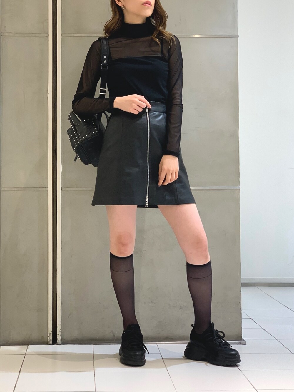 オールブラックコーデ! シアートップス×レザースカートで甘辛ミックス。