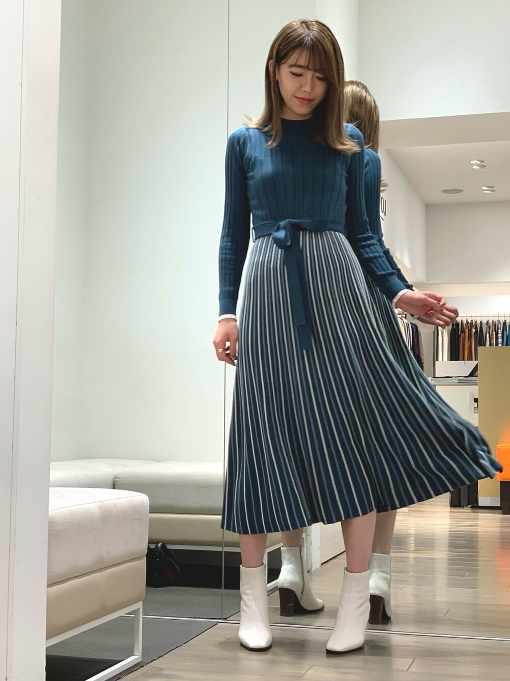 minaのワンピース「ストライプ コンビ ニットドレス」を使ったコーディネート