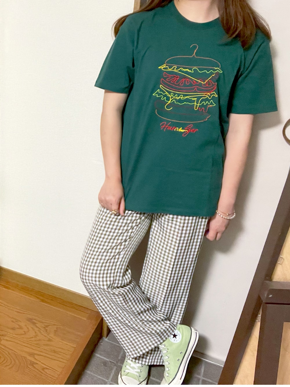 着用コーデ:4件momoのTシャツ/カットソー「ハンガーバーガー|刺繍Tシャツ(グリーン)」を使ったコーディネート