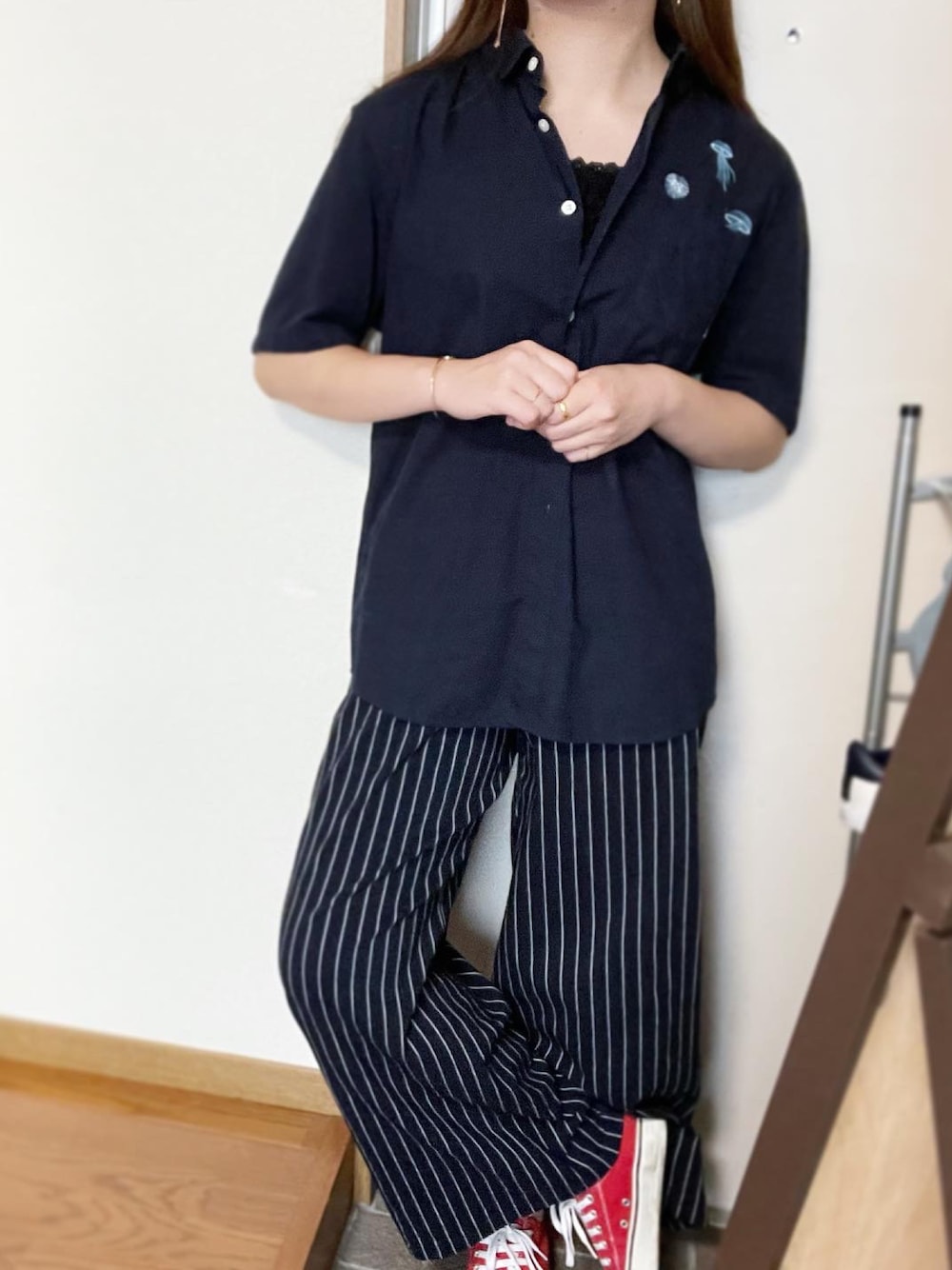momoのシャツ/ブラウス「ピケコンビ半袖シャツ(ドローイングオブジェリーフィッシュ)(ネイビー)」を使ったコーディネート