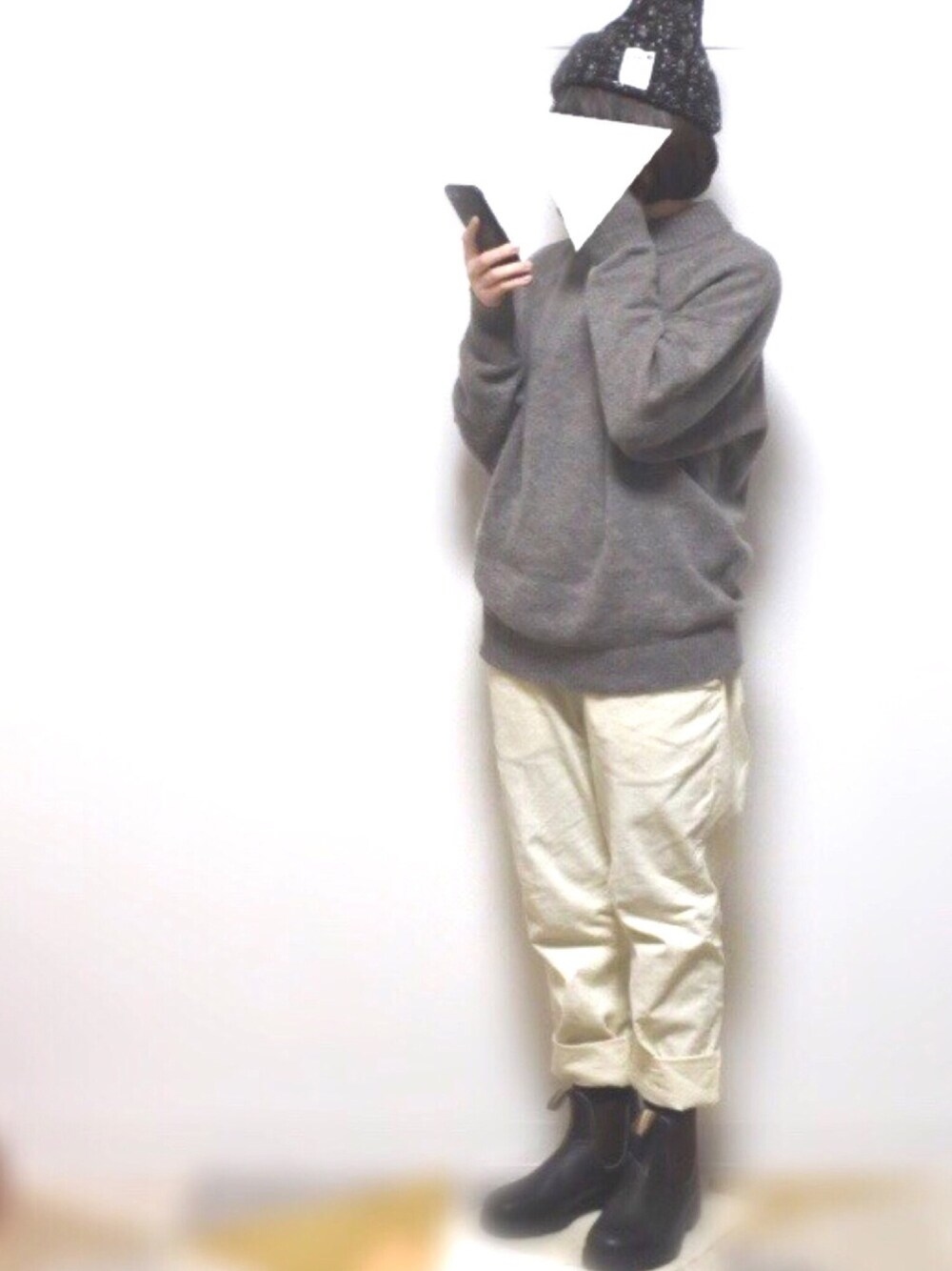 2018.3.8 シンプル。 ユニクロのニットはゆるいハイネックとグレーとベージュの間みたいな色がお気に入り◎ 写真では完全にグレー。