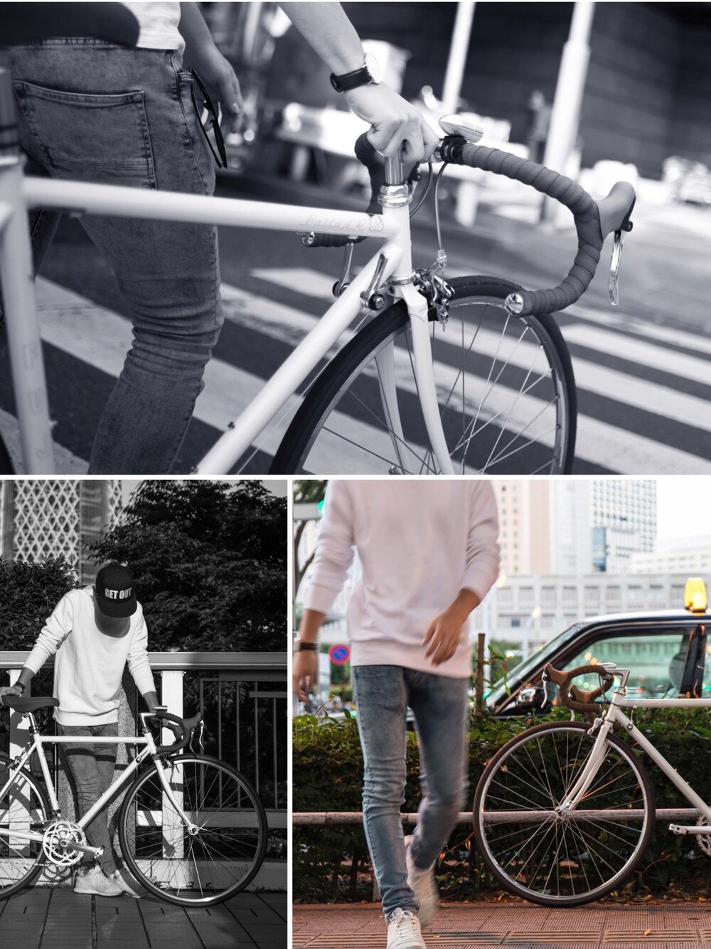カメラマンの友人と外ロケやった時の写真が たんまりあるので何枚か..見にくいですよね。すまぬ🙇 bikeが白のフレームなので、最近はこんな感じに 足元と白で挟んで合わせる事が増えてます。 そうすると、ジーンズの質感がとても綺麗に出てくれるんですよ~写真はそれを強調したモノクロに(手元に届いた時には既に..🙇)更新、更新、嬉しいな。