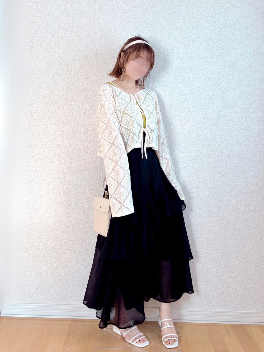 モノトーンでまとめた大人ガーリースタイル🐈⬛♥️ 最近キレイめ系着てなかったので、この感じ久々...♪*゚ 系統統一せず、その日着たい物を着るタイプです♥ chicoのスカートは、見えずらいけど3段ティアードです♥画質悪すぎて可愛さが伝わらない…😭(商品画像見て✨) 裾がヒラヒラしてめっちゃ可愛い1枚なのです🥺✨ リボンカーデはしまむらのです🎀 ボタンじゃなくてリボンで止めるアイテムってすごく好き♡♡ レースの透かし編みになってて高見えするよ👀💓 今日も見ていただき、ありがとうございます♡ いいね、お気に入り、フォロー、フォルダインとっても嬉しいです🦙🫧 いつも感謝です♥