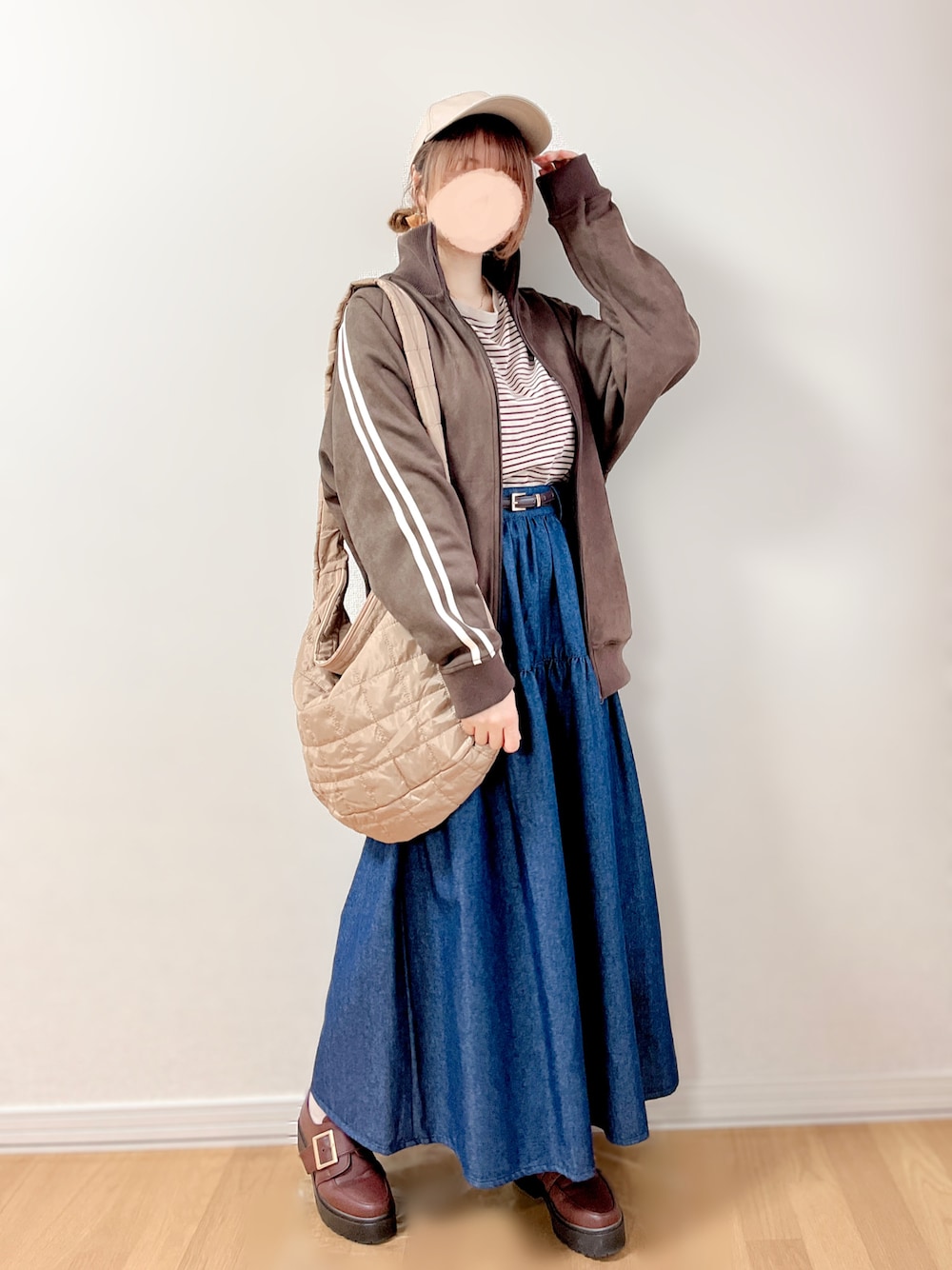 トラックジャケットコーデ𓂃◌𓈒𓐍 普段甘めなのでトラックジャケットは初挑戦!! スポーティ過ぎないのが良くてMUHETのにしました♪ 決め手はスエード素材とこのお色🤎生地にしっかり厚みがあるので秋アウターとして長く使えそうです! Mサイズでお尻がすっぽり隠れる丈で、ゆるっと着れてかわいい♡♡ 色違い欲しいくらい気に入りました🫡💕 スカートはエヘカのです。高めの切り替えでふんわりフレアでも膨張しないよ! こちらはウエスト大きめだったので少し詰めました🪡✨ モスモスのノベルティバッグがノベルティに見えない程優秀な件🥺👍✨ 裏地は花柄で見えない部分まで可愛くて、必然の2色GETꀸ*⋆.* 今日も見ていただきありがとうございます♡♡ いいね、お気に入り、フォルダインもとっても嬉しいです!! ありがとうございます🐜💕