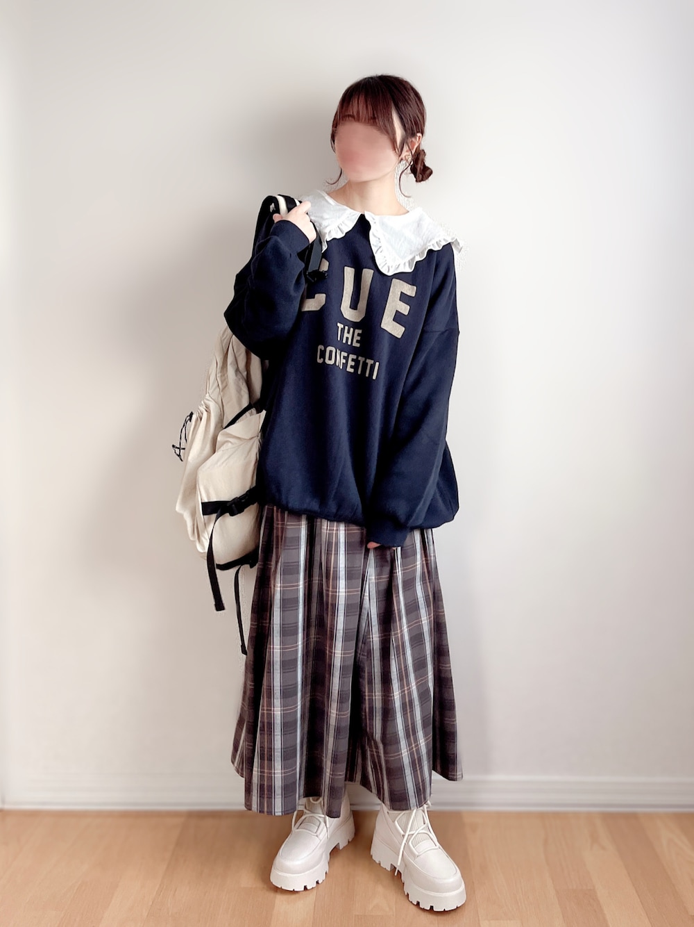 ゆるカジュアルコーデ❤︎.* 2色買いしたモスモスのスウェットのネイビーの方♪ 青み控えめの暗めネイビーなのでイエベでも着やすいお色♡♡ 個体差なのかグレーのより2cmくらい小さめでした🤣 (私にはこのサイズの方が合う!!) スカートは気になってたのが半額になった時にすかさずget!!! グレーチェックの色味が可愛い過ぎて買って良かったです♡♡ リュックも最近お迎えしたもの❤︎.* とにかく軽い白リュックが欲しくて見つけたのがこれ! 所々黒入っててオシャレ見えするし、ナイロンだからめっちゃ軽いのがいい🤍 2、3枚目でデザイン見れますよー👀✨ 今日も見ていただきありがとうございます⸜🌷︎⸝ いいね、お気に入り、フォロー、フォルダインもありがとうございます( * ॑꒳ ॑*)⸝ᵗʱᵃᵑᵏᵧₒᵤ