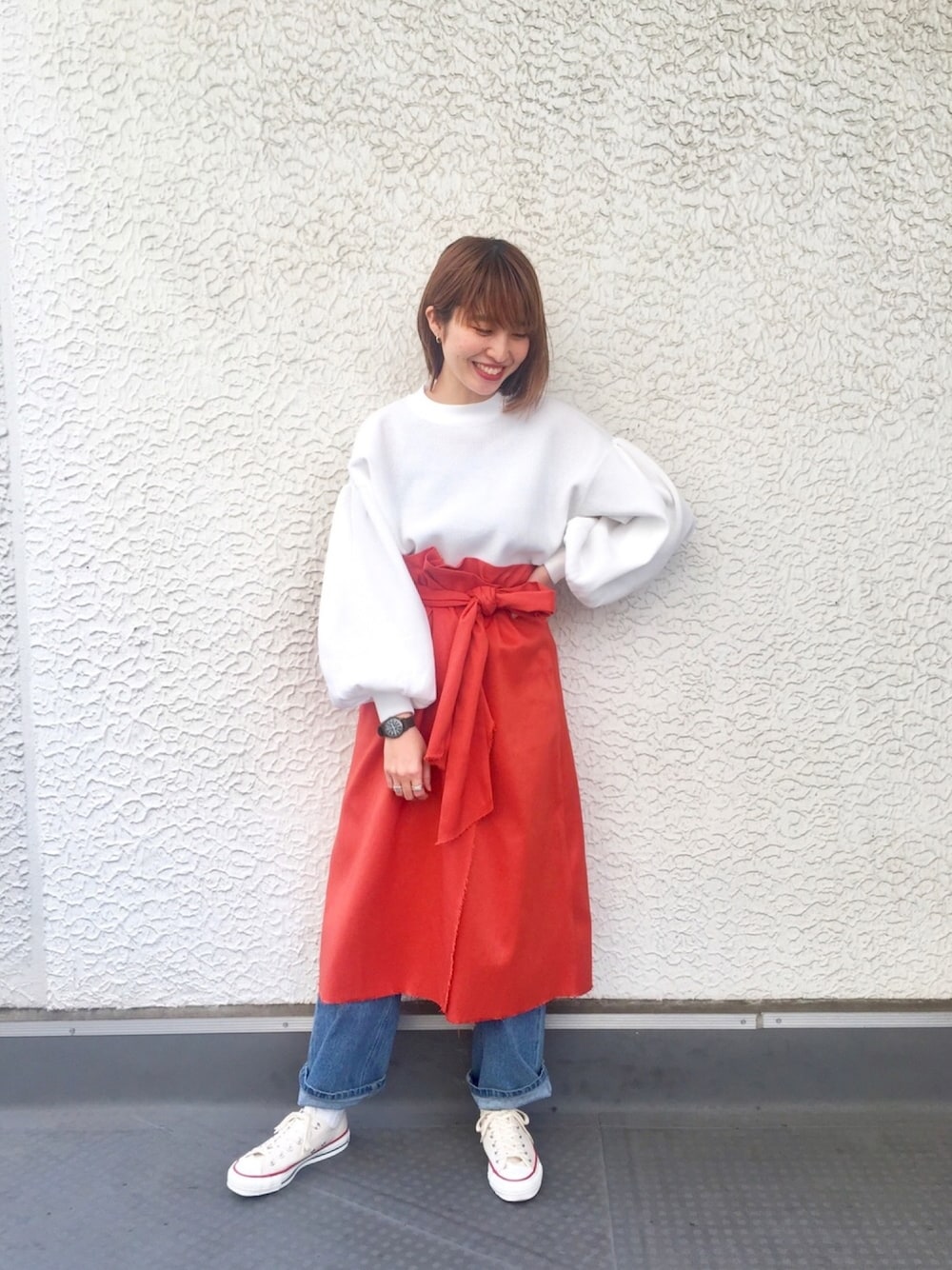ボリューム袖かつレイヤードスタイルでボリュームが出るので、ウエストでしっかりメリハリをつけました◎ オレンジがポイントです〜!!