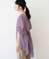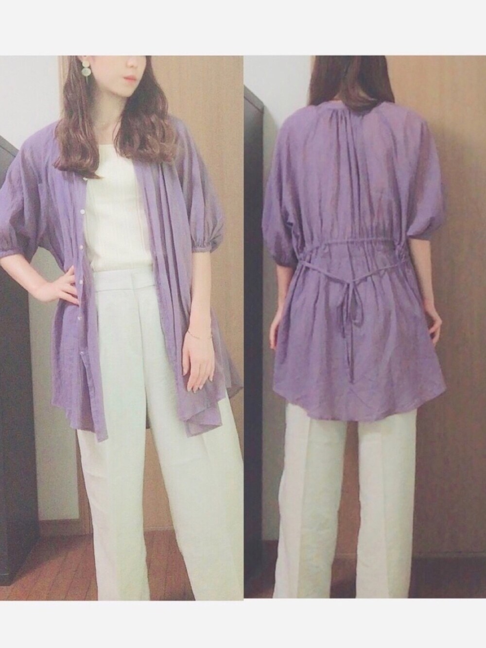 ホワイトのトップスとパンツにパープルのシャツ💜 2wayのシャツを今回は羽織で ♪ シャツのリボンは後ろで結んで 後ろ姿もスッキリ可愛らしくしてみました☺︎ パンツもリネン素材で、どこも締め付けがなく ALLゆったり楽ちんコーデ👻💕