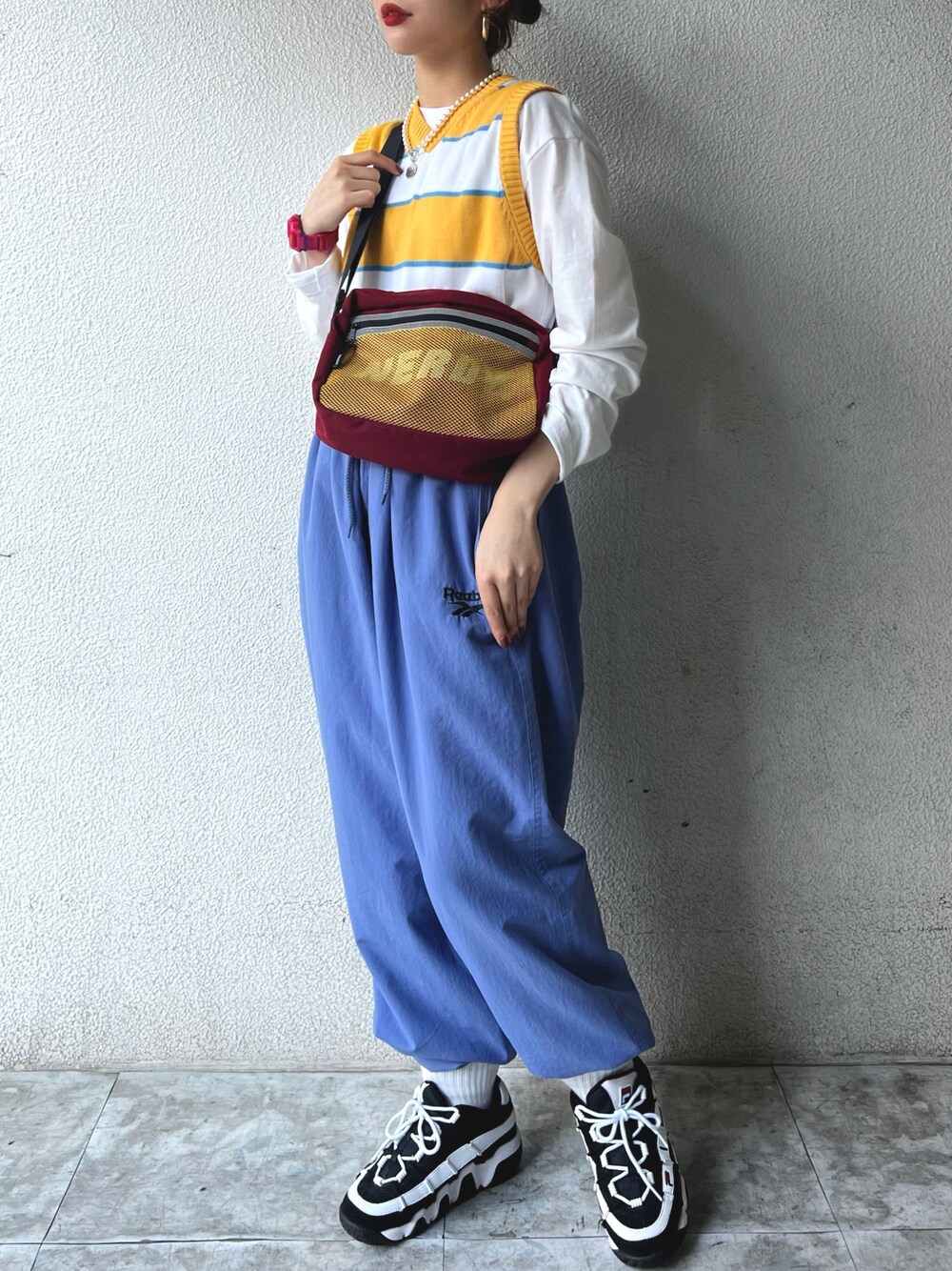 古着のナイロンパンツに古着のニットベストを合わせて カジュアルストリートコーデ🎿🛝 小物を合わせてスポーティー感はUPさせて、 それに対してアクセサリーを投入して運動着感をなくせるように🏌️♂️💫