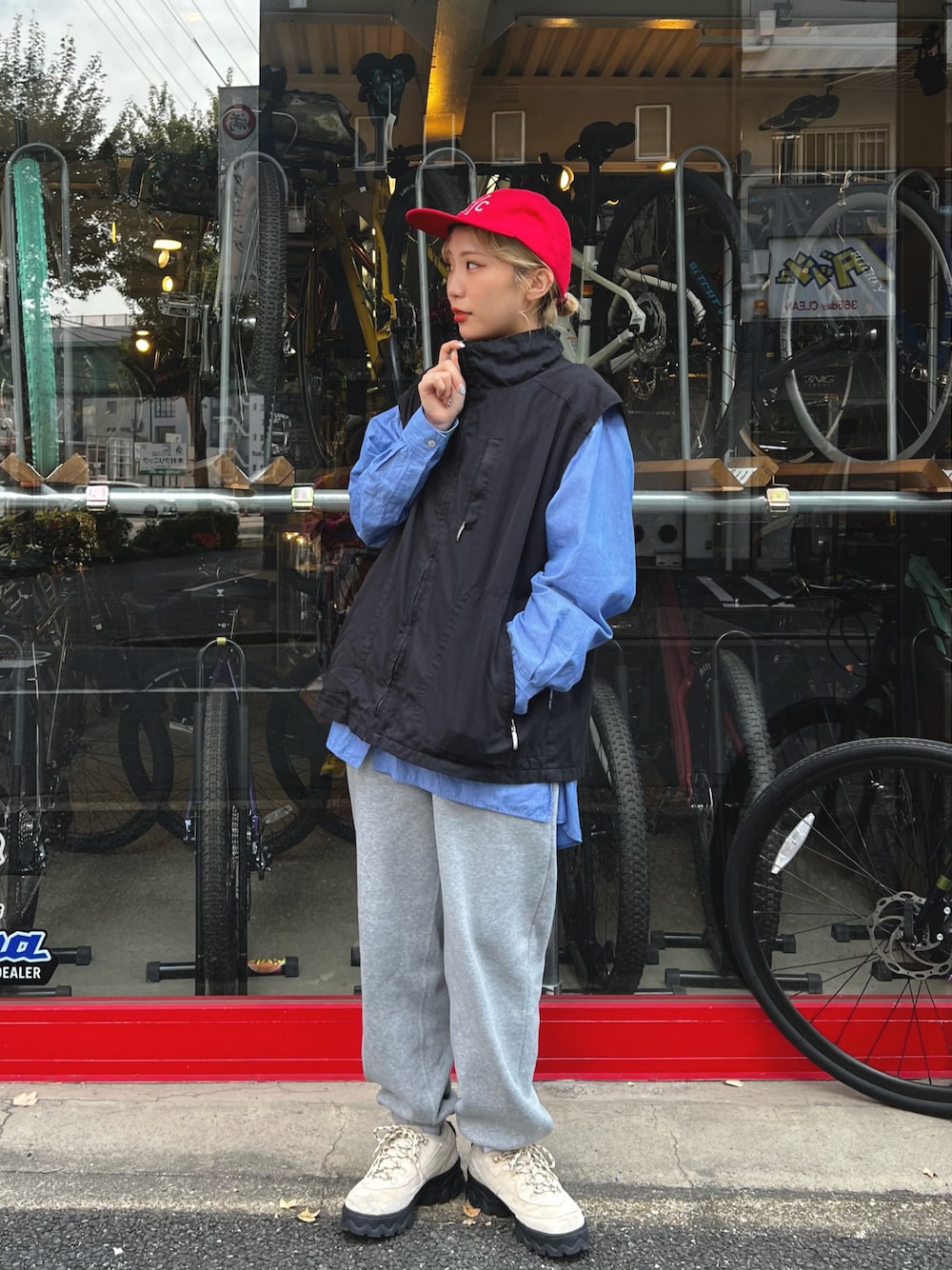 三連休最終日の出勤コーデ🧢 シャツに古着のナイロンベスト、 スウェパン合わせでカジュアルコーデ。 出勤の日は動きやすいパンツコーデが どうしても多くなってしまいます😂👖