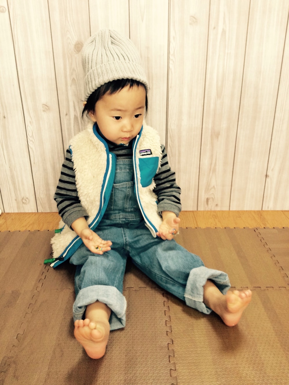 いつもお気に入りを着せると男の子みたいになっちゃいます(;^_^A ボルダリングで手とアゴを負傷してチーンと落ち込んでおります。