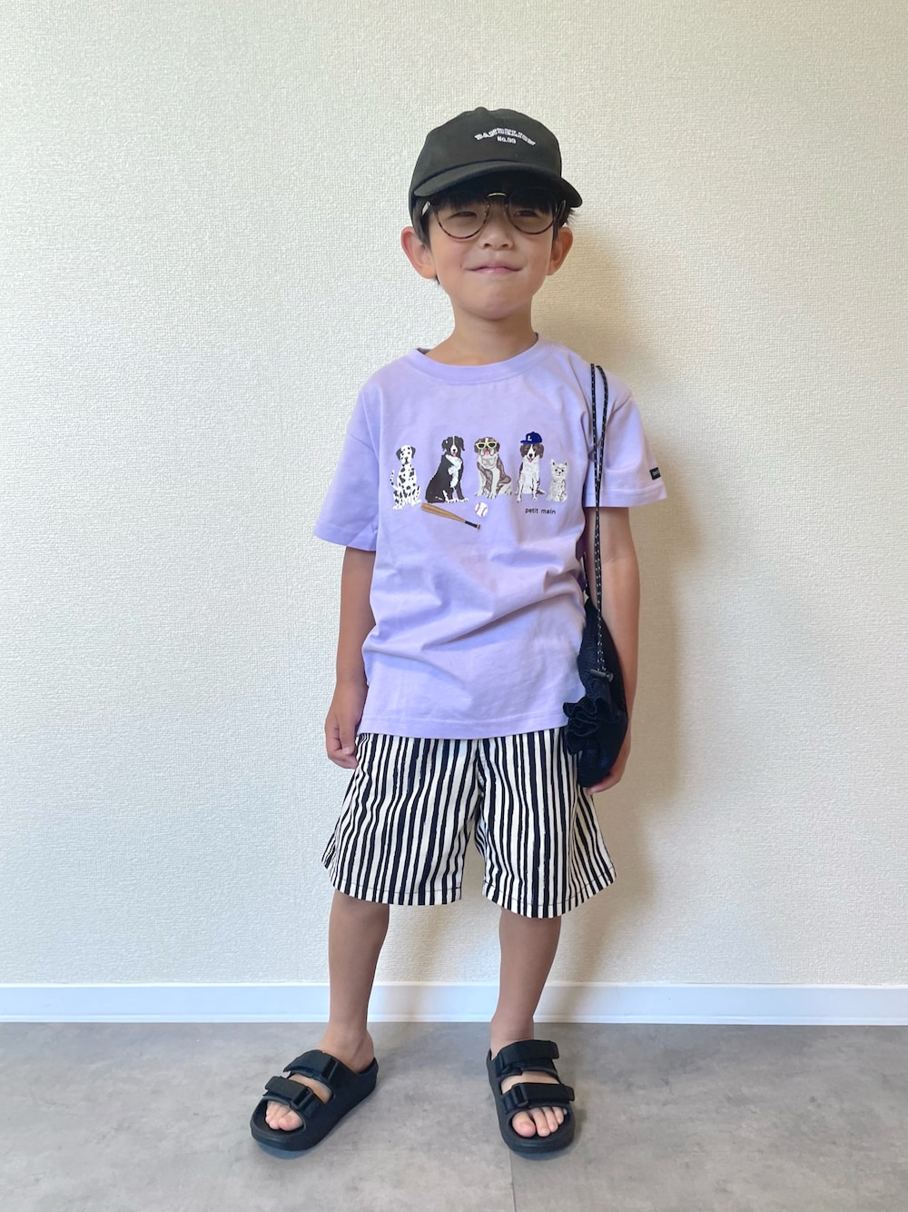 ご覧いただきありがとうございます🍀 パープル×ブラックコーデ。 この配色、やっぱり好き♡ Tシャツは弟くんお気に入りアイテム🐶⚾️ 5y〻106cm/16kg/👣17.5cm