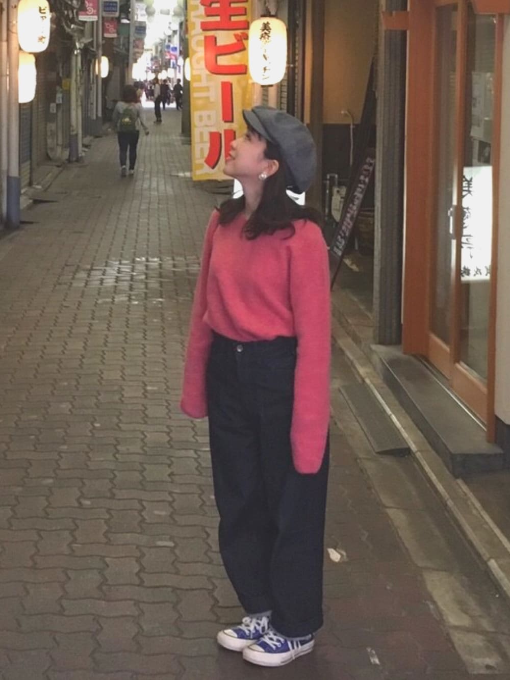 ピンクのニット、お気に入り🙌🏻🌟 楽ちんカジュアルなスタイルもすきなのです☺️ この日はレトロな商店街をぶらぶら〜