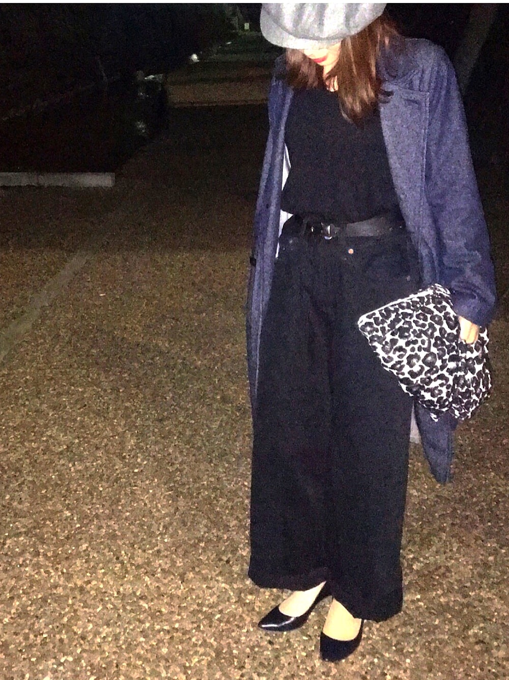 ブラックのワントーンコーデ🌟 HURRAYHURRAYのボトムは、古着のデニムのリメイクなので一点一点全然違うんです👀 極太ワイド、今度はガチャベルトでがっつり締めて着たいな〜
